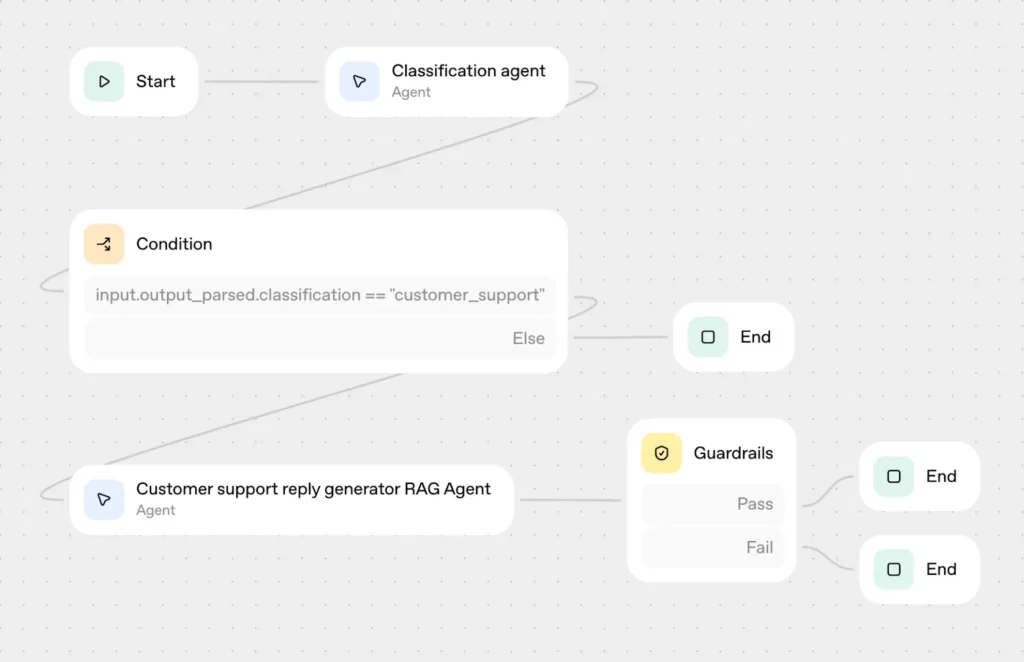 - Agent Builder: Chat-first entry point with a simple Start node, branching via conditions, and agent nodes that do the reasoning. Great for the middle of a flow. For background or event triggers, you will likely front it with your own code or an orchestrator.